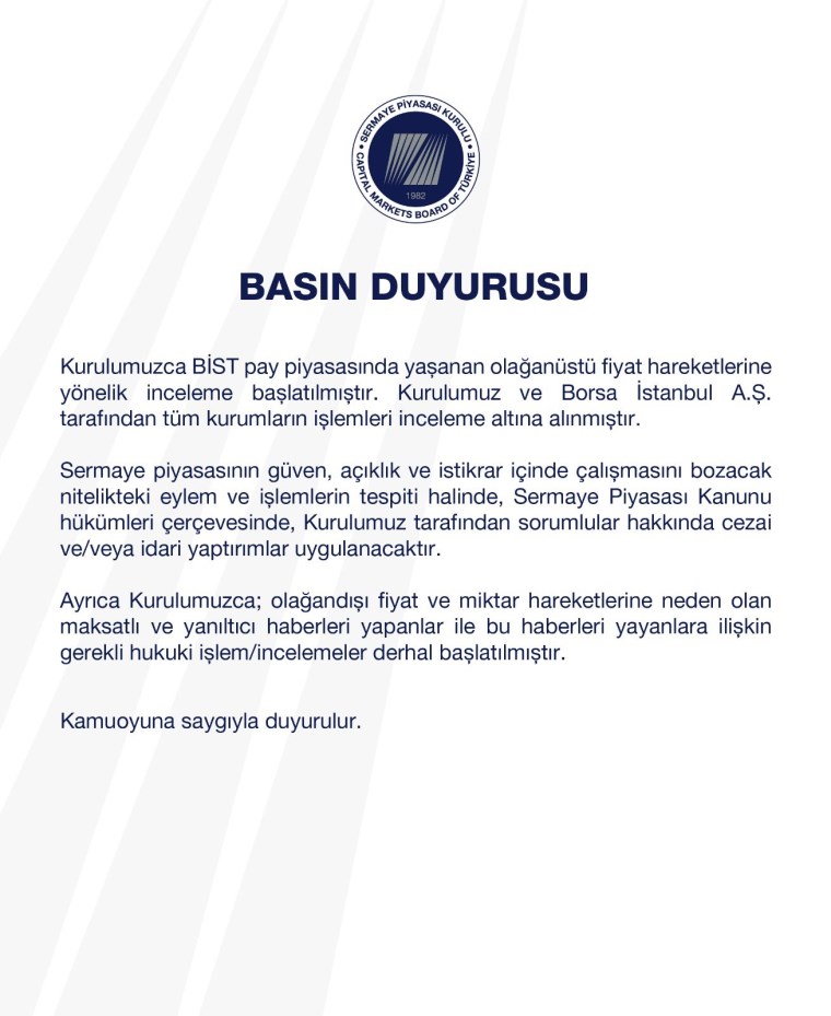 “Kurulumuzca Bist Hisse Piyasasda Yaçanan Harikulâde Fiyat Hareketlerine Yönelik Inceliamet ve Borsa Iknbul. Heyetimiz ve Borsa İstanbul A.sh. Tarafezdan Tun.
