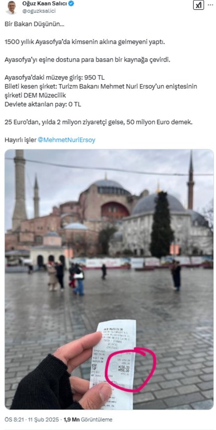 Ayasofya’Daki Mze Girşte Bilet Kesen Dem Müzecilik’in Mehmet Nuri Ersoy‘Un enyiştesin ilişkkin Oldusunu Belirten Salon, Ersoy’un “1500 Yivk Ayasofya’Yı Eşin Dostuna Para Basan Birka Knoğa çavirdi” dedi.