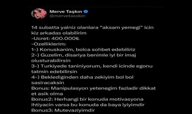 Sosyal Medya Hesabizdan Bir Ilan Yaymlayan Merve Taşelerin, 14 Şubat’de Yalnez Olanlar Için Fiyat karşağilisin etmiy ve 400 bin tl de fiyat belirlemiy.